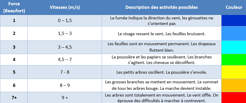 El confort del viento es una cuestión central del estudio. En cuanto la velocidad del viento es lo suficientemente alta como para interferir en los movimientos, perturbar determinadas operaciones o desestabilizar a las personas, el viento se convierte en una limitación operativa por derecho propio. Como ilustra la tabla siguiente, ciertos usos pueden verse perturbados a partir de 4,5 m/s, mientras que la estabilidad de la marcha puede verse afectada por encima de 8 m/s. Estos puntos de referencia proporcionan un vínculo sencillo entrela intensidad del viento y sus efectos prácticos sobre los usuarios, las zonas de trabajo y las infraestructuras.