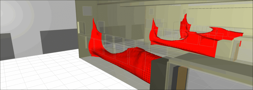 La acumulación de aire caliente en el techo durante las pruebas puede hacer que el sistema de rociadores se dispare inesperadamente. EOLIOS utiliza la simulación CFD para identificar estas zonas críticas y recomienda soluciones como la adición de rejillas adicionales para garantizar un control térmico eficaz y seguro.