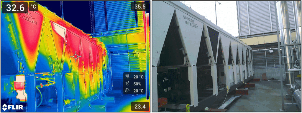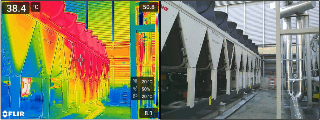 Las lecturas termográficas muestran claramente zonas de recirculación de aire caliente (bucle térmico) alrededor de algunos enfriadores de aire. Las imágenes de infrarrojos muestran halos calientes y lenguas térmicas que se desarrollan alrededor de los capós transparentes, signo del descenso del penacho y de la reaspiración parcial por los intercambiadores de calor vecinos. En las inmediaciones de los capós y las carcasas de los enfriadores de aire, la temperatura aparente aumenta y se estira en la dirección del flujo, lo que indica una dilución insuficiente de las emisiones y una recirculación en trayectorias cortas. El fenómeno se amplifica cuando el viento incidente choca contra las pantallas o paredes laterales, creando zonas de baja velocidad y vórtices de estela que atrapan el aire caliente en las tomas de aire.