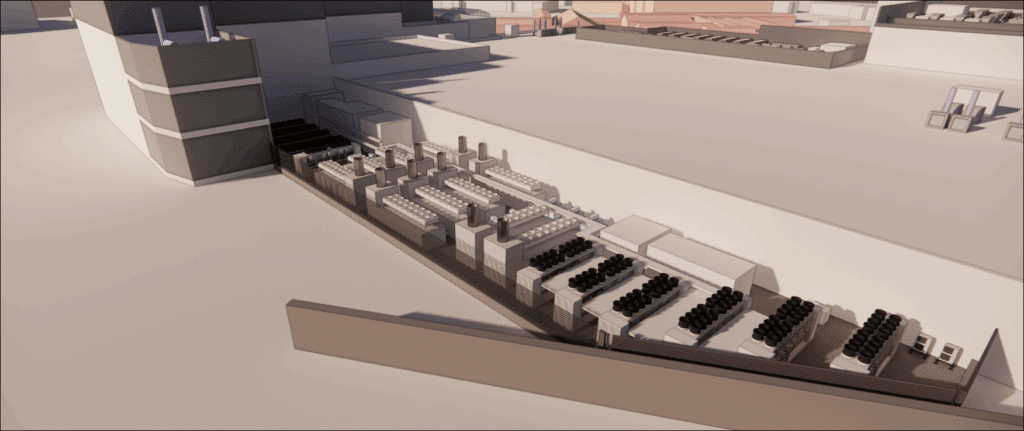 El perímetro abarca el área técnica sobre el terreno, dividida en tres sectores funcionales -zona izquierda, zona central y zona derecha – para reflejar las diferencias de exposición al viento, la proximidad de las paredes y la lógica de aspiración propia de cada unidad. El inventario incluye 11 enfriadoras, 8 generadores y 10 transformadores; los cerramientos ya están colocados en el lado derecho y la mayoría de las máquinas están equipadas con toberas. La configuración de los respiraderos de los EG, situados en el exterior, está diseñada para desviar los penachos y evitar que sean ingeridos por los enfriadores de aire vecinos.