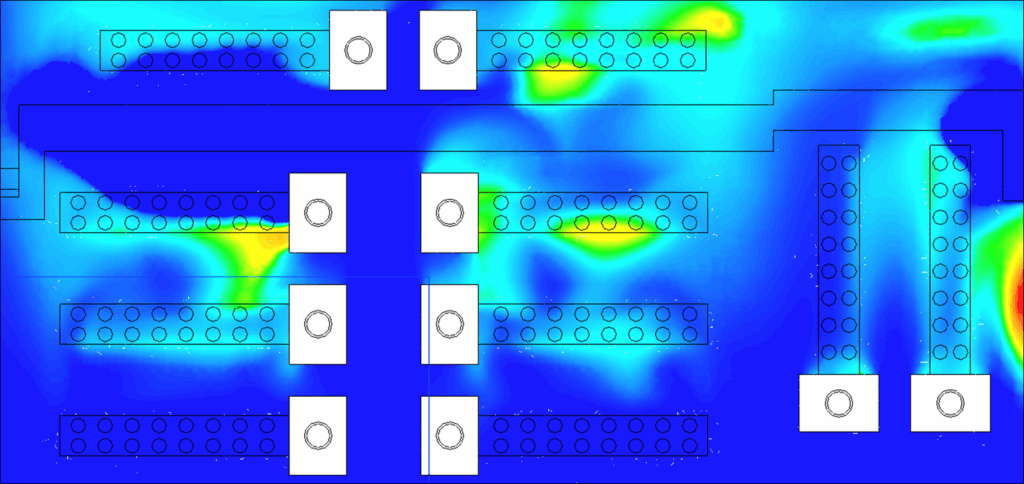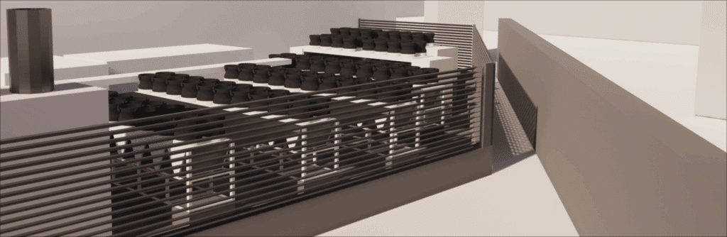 La zona técnica en el suelo del centro de datos estudiada por EOLIOS incluye enfriadores de aire, generadores y transformadores en un entorno urbano oculto donde puede producirse recirculación térmica debido al cerramiento y a la interacción entre la descarga y la aspiración. El objetivo principal es estabilizar la temperatura del aire que entra en los intercambiadores yhomogeneizar los campos de velocidad en la aspiración para aumentar la robustez en condiciones severas (vientos desfavorables, cargas elevadas), limitando al mismo tiempo el reflujo del penacho hacia las máquinas. La introducción de rejillas, como los capós, y de elementos filtrantes, como las rejillas, es una de las palancas estudiadas para romper los bucles y guiar un aporte de aire más favorable hacia los intercambiadores.