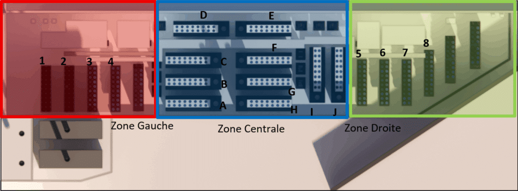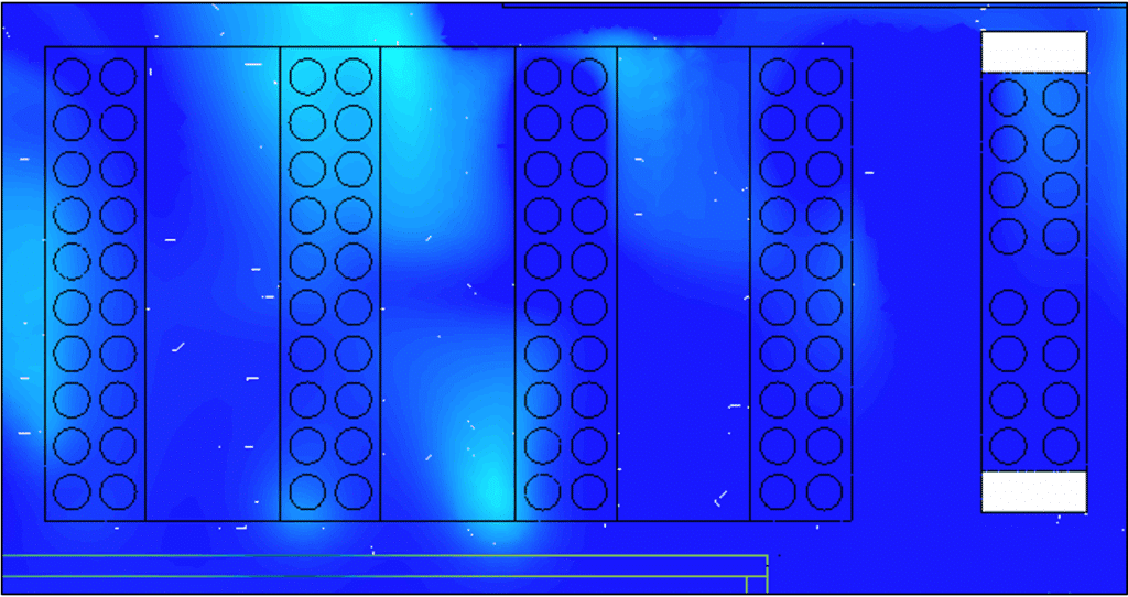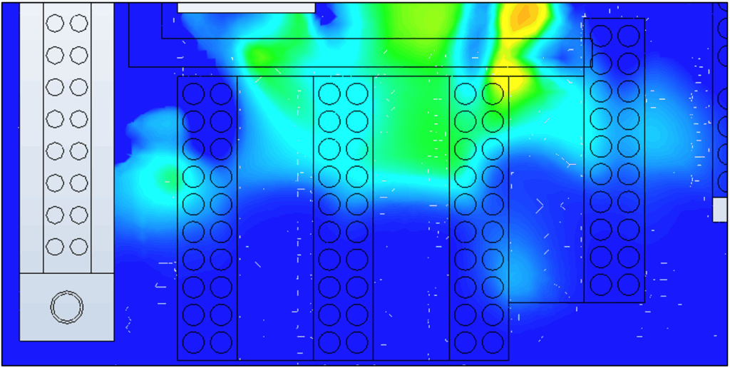 En estas condiciones, la recirculación sigue siendo moderada, lo que confirma que las prioridades de actuación deben concentrarse en los extremos de la zona técnica, donde los efectos decerramiento y pared generan retornos más marcados. Por tanto, en el centro conviene un tratamiento más ligero: mantener un flujo de aire homogéneo, vigilar los bordes libres y realizar comprobaciones puntuales durante los vientos de vuelco o los regímenes transitorios de la máquina. Esta calibración minimalista garantiza la coherencia aeráulica del sector, preservando al mismo tiempo la flexibilidad de funcionamiento y la facilidad de mantenimiento.