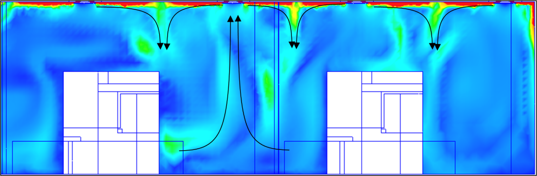 Como resultado de este soplado paralelo, el flujo de aire recorre el techo y, en particular, consigue pasar por encima de los tabiques centrales, que están abiertos en la parte superior. Esto reduce el riesgo de contaminación en la zona.