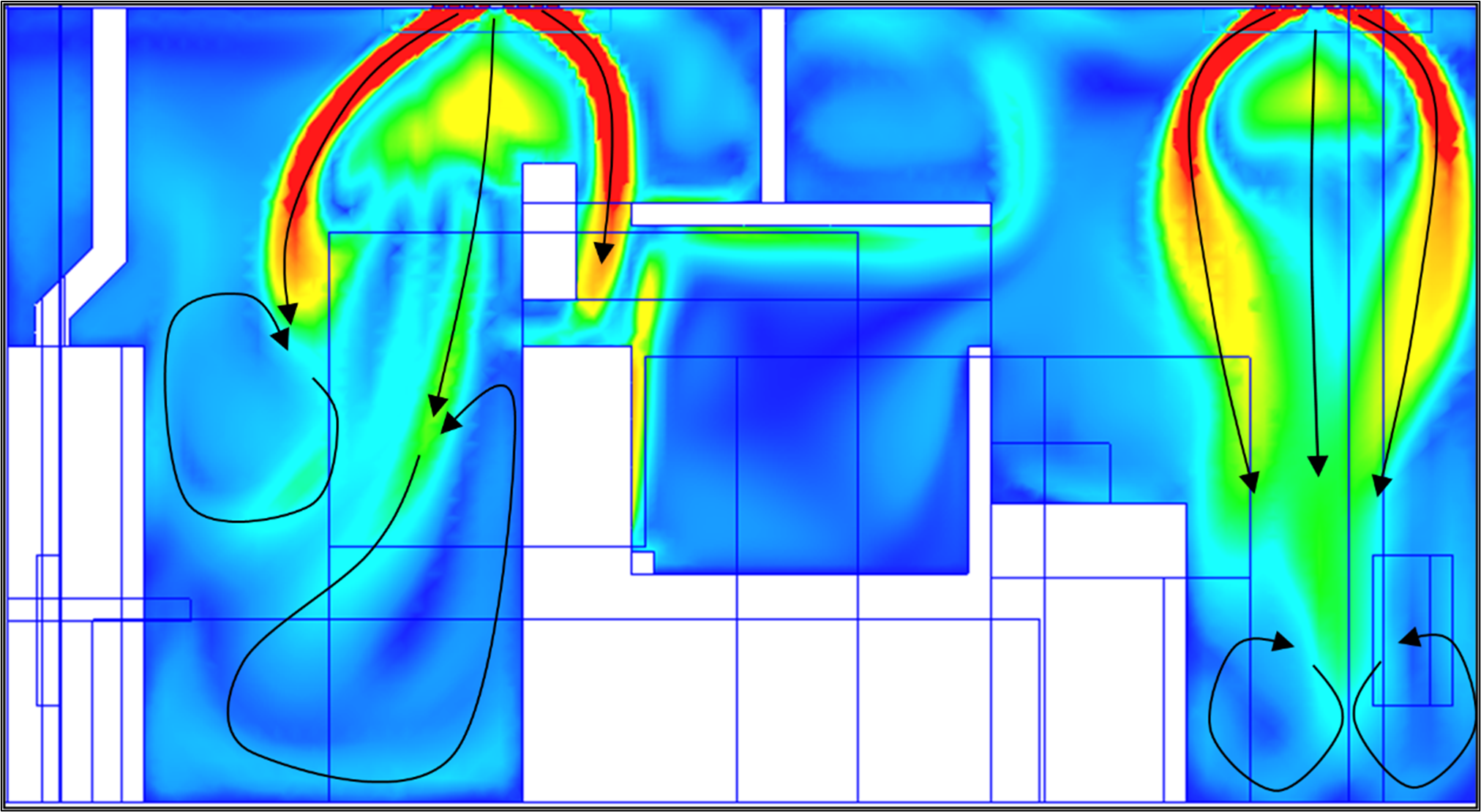 Gracias a este enfoque riguroso, es posibleactuar de forma selectiva identificando los puntos débiles del sistema y probando virtualmente distintas modificaciones (tabiques, tipos de rejillas, compartimentación del pasillo ascendente, etc.).