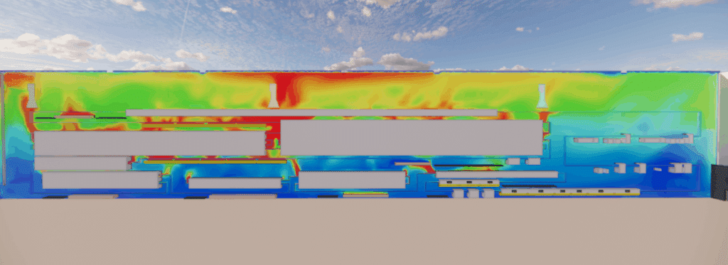 Las simulaciones se realizaron mediante el método CFD (Computational Fluid Dynamics), que permite analizar y predecir los movimientos de fluidos como el aire. Este enfoque virtual permite simular los fenómenos termo-aerodinámicos de la instalación, teniendo en cuenta las interacciones entre las distintas superficies, las fuentes de calor y los flujos de aire. Gracias a la CFD, es posible visualizar y analizar detalladamente los flujos y las temperaturas, contribuyendo a una mejor comprensión de los procesos y optimizando el rendimiento y la seguridad de las instalaciones.