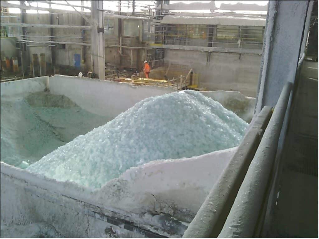 En una planta industrial dedicada a la fabricación de sílices técnicas utilizadas en diversos sectores, como neumáticos y cosméticos, el proceso se basa en la fusión de silicato de sodio a alta temperatura. Una vez calentado a unos 1.200°C, el material fundido se transfiere a lingoteras, donde se enfría rociándolo con agua antes de almacenarlo temporalmente en un foso.