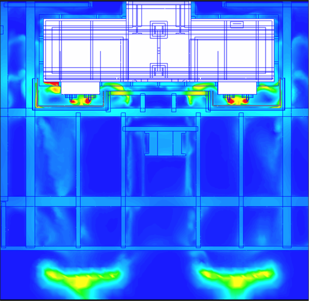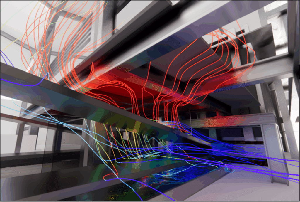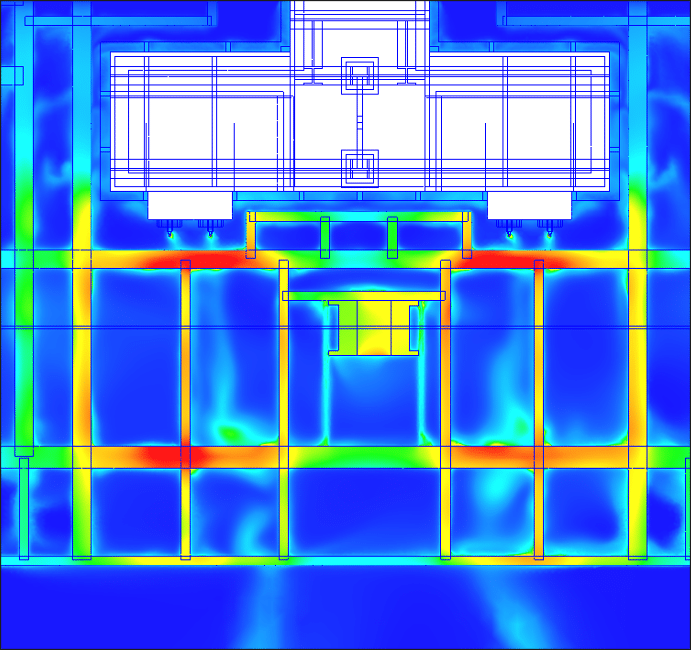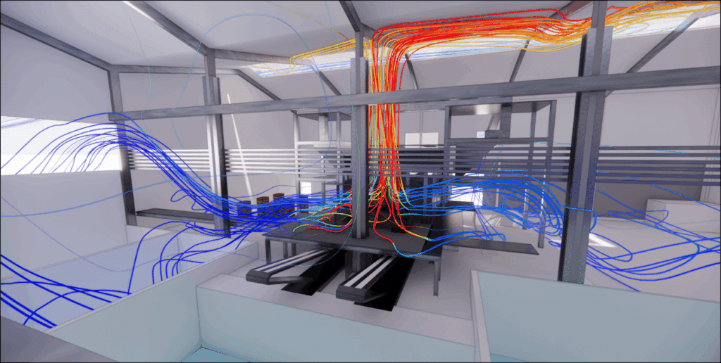 Además de estos problemas de radiación, el funcionamiento del horno genera una potente circulación ascendente de aire, ligada a la liberación de calor intenso en un edificio que está en gran parte abierto al exterior. La dinámica de los flujos de aire es compleja: las corrientes térmicas naturales, la velocidad del viento, la forma del edificio, las plataformas suspendidas y los obstáculos mecánicos interactúan para producir zonas de recirculación o estancamiento del calor en sectores localizados, que a menudo son críticos para el funcionamiento. Así, las simulaciones revelaron vetas de aire caliente que corrían a lo largo de ciertas paredes, calentamiento residual en fosos o zonas de ventilación, y diferencias significativas entre el norte y el sur de la nave.