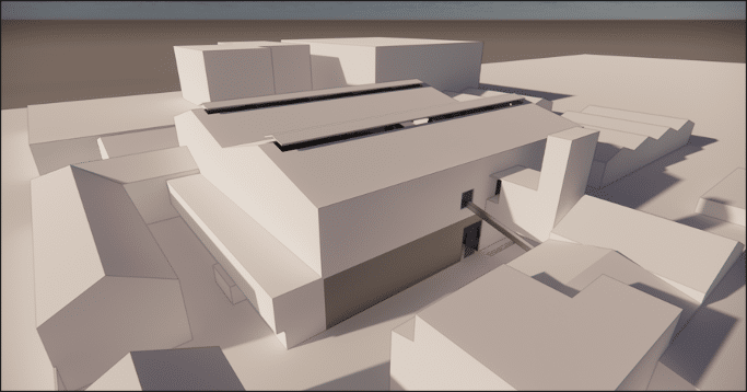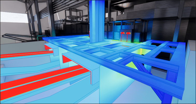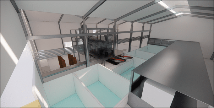 El modelo CFD se desarrolló a partir de los planos suministrados, las fotos tomadas durante la auditoría y un estudio detallado del lugar. El objetivo era representar con precisión los volúmenes, estructuras y equipos que influyen en el flujo de aire y el intercambio de calor. En concreto, el modelo incorpora plataformas, vigas, fosos de refrigeración, aberturas al exterior, cortinas y futuras instalaciones previstas alrededor del horno eléctrico.